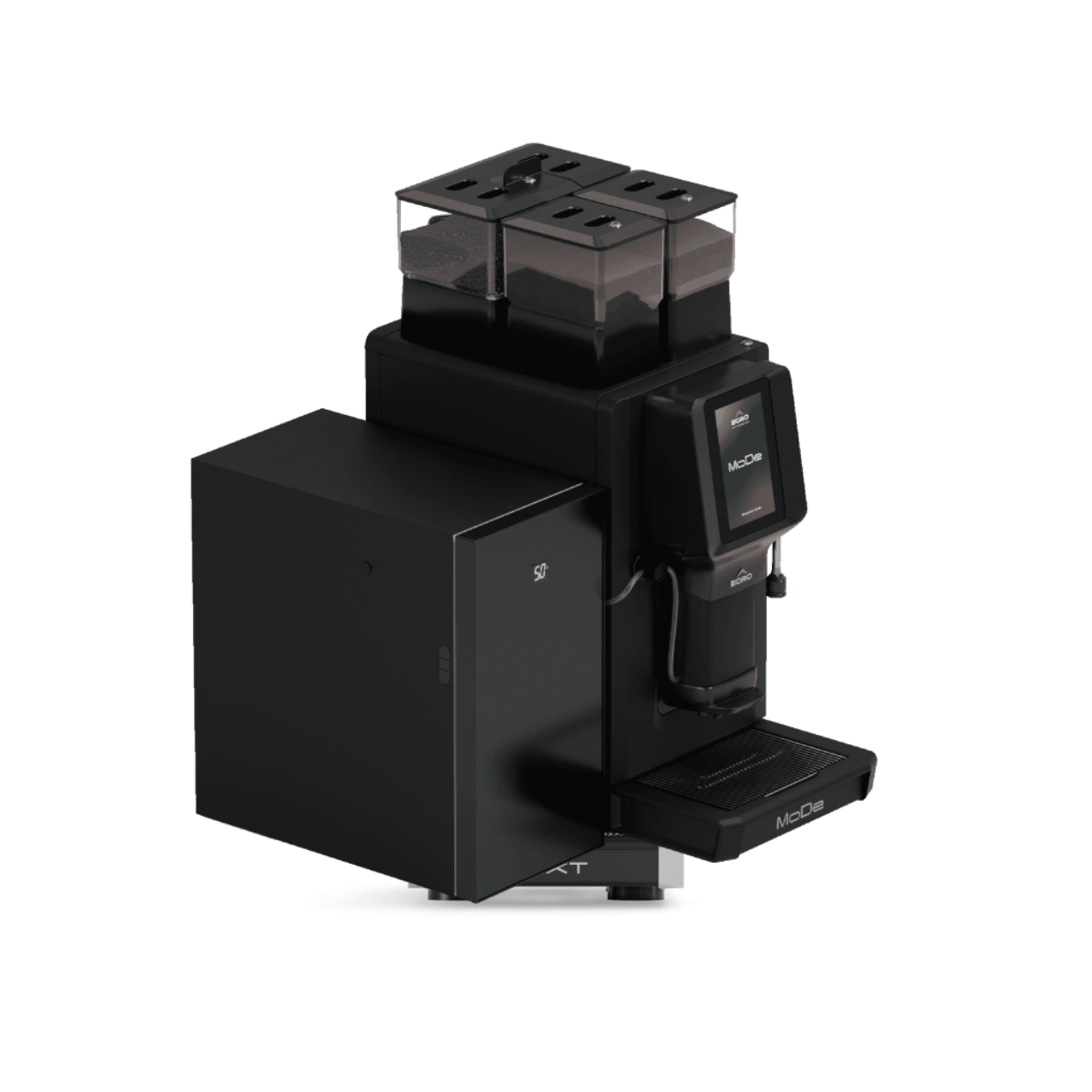 MoDe is available in 3 versions – Pure Coffee, Quick, and Pro Milk – and can be configured with different milk systems and fridges, add-ons, payment systems and optionals. All MoDe versions can be configured with 1 or 2 coffee grinders and 1 or 2 built-in 2-litre hoppers for powders.